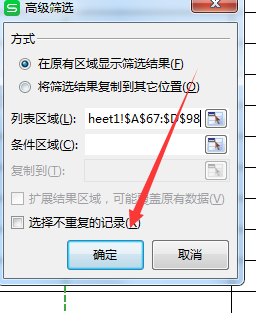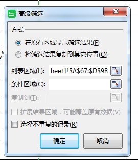 2、然后在高级筛选窗口选择列表区域与条件区域。