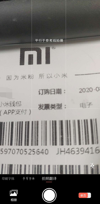 4、选择“拍照”,进入拍照模式,将镜头对准要识别的纸张等,并拍照。