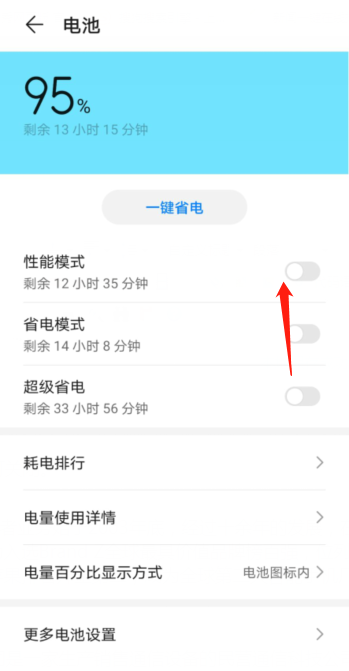 3、接下来我们只要点击打开【性能模式】的开关即可打开,关闭开关即可关闭。