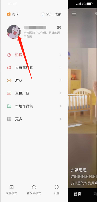 2、进去快手之后,打开侧边栏,点击个人账号头像;