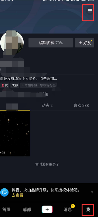 2、然后点击右下角【我】,点击右上角菜单图标。