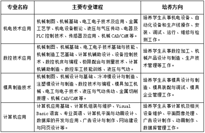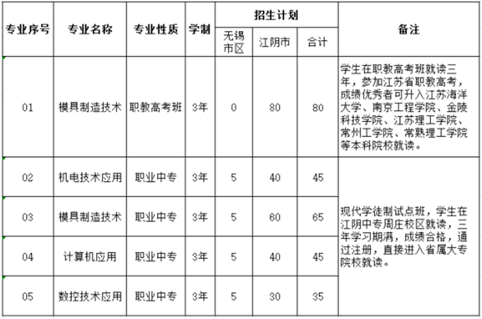 学校依托本地产业结构,以机械制造类专业为建设重点,形成了以模具制造技术专业为特色,集机电技术应用、数控技术应用、计算机应用为一体的协同发展专业群,被无锡市教育局确认为“课改实验点”学校,其中模具制造技术专业为无锡市示范专业,专业课程《机械基础》《冲压模具设计与制造》等为无锡市精品课程。学校建有实训大楼,设有模具加工、CAD/CAM、电工电子、PLC、数控、钳工、车工、图形图像处理等实验实习室;拥有电子阅览室、图书室、多媒体教室等学习场所;建有配套设施齐全的师生员工食堂、浴室、学生公寓及标准化塑胶运动场等生活场所。学校是学生学习、生活、成才的理想场所,办学经验多次被《中国教育报》《德育报》《无锡日报》《江阴日报》等报道。
