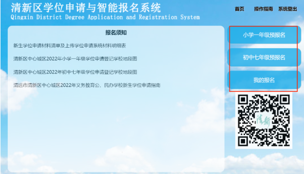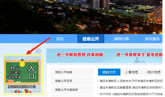 报名电脑端入口打开网页,访问清远市清新区人民政府门户网站,通过政府网上的入口进入“清新区学位申请与智能报名系统”。