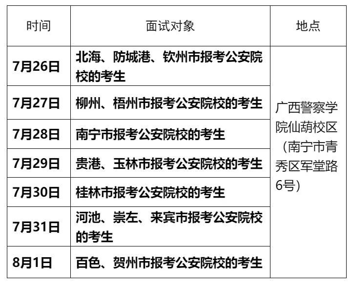 7月26日至8月1日为招生面试、体检和体能测评时间。招生考察意见合格的考生,持本人身份证、户口本、高中毕业证原件及复印件,准考证、《公安院校公安专业招生考察表》(密封)及相关考察材料和近期一寸免冠照片3张,自行前往广西警察学院仙葫校区参加公安厅统一组织的公安院校公安专业招生面试、体检和体能测评。在规定时间内未到指定地点参加面试、体检、体能测评的考生,视为放弃志愿。