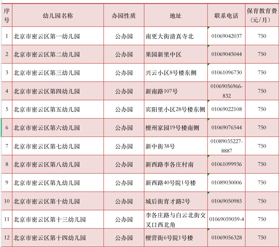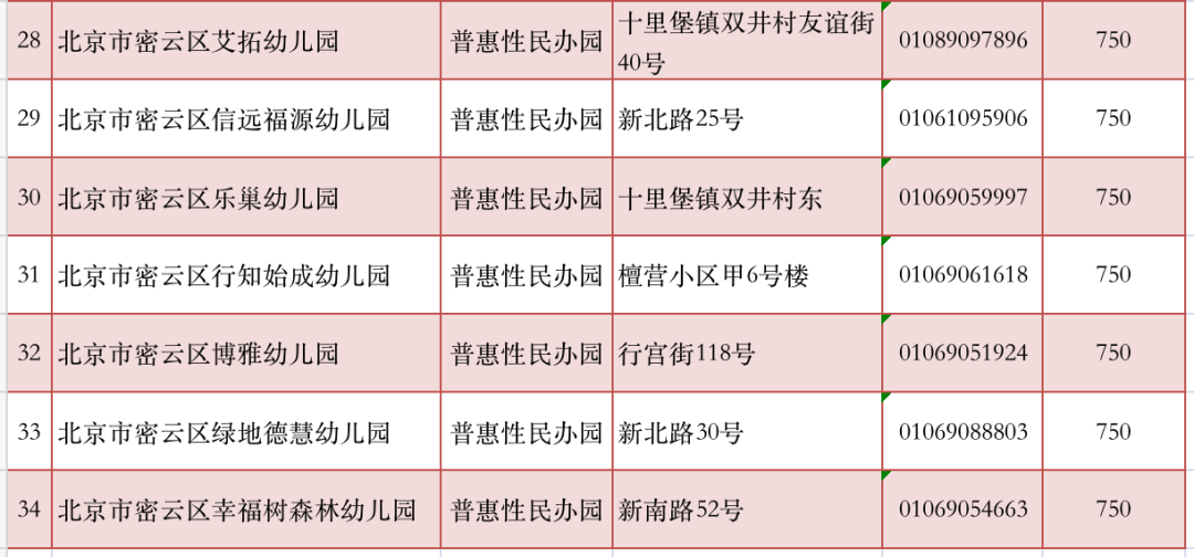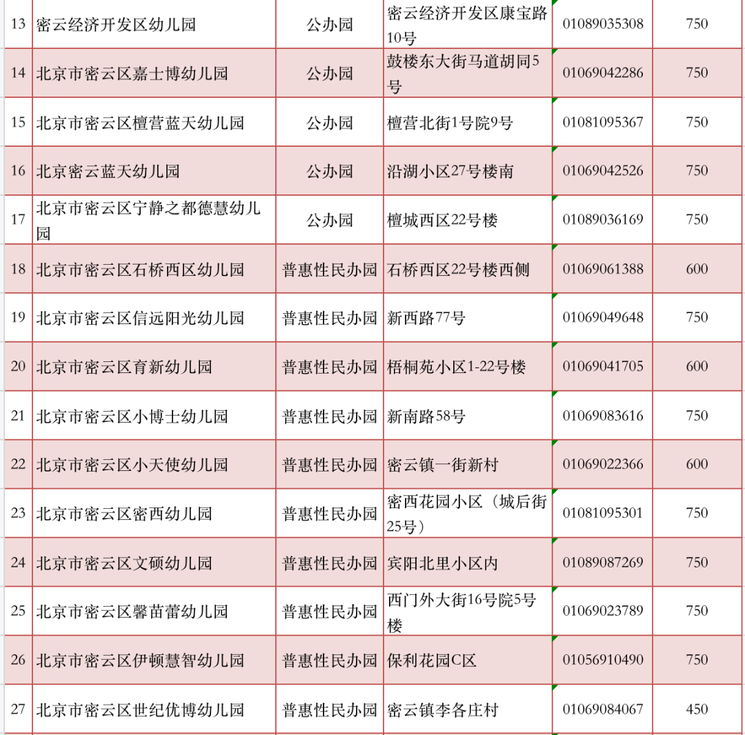 2022年北京市密云城区普惠性幼儿园名单