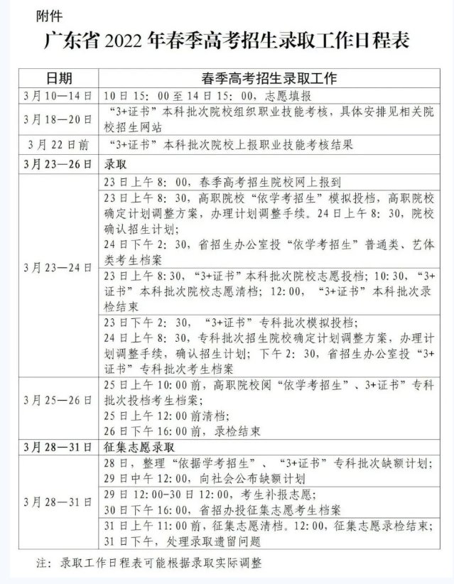 春季高考招生录取时间为3月23—31日,详见《广东省2022年春季高考招生录取工作日程表》(附件)。