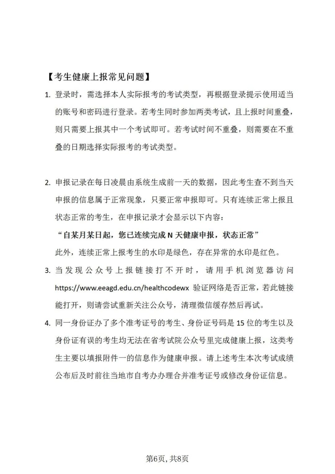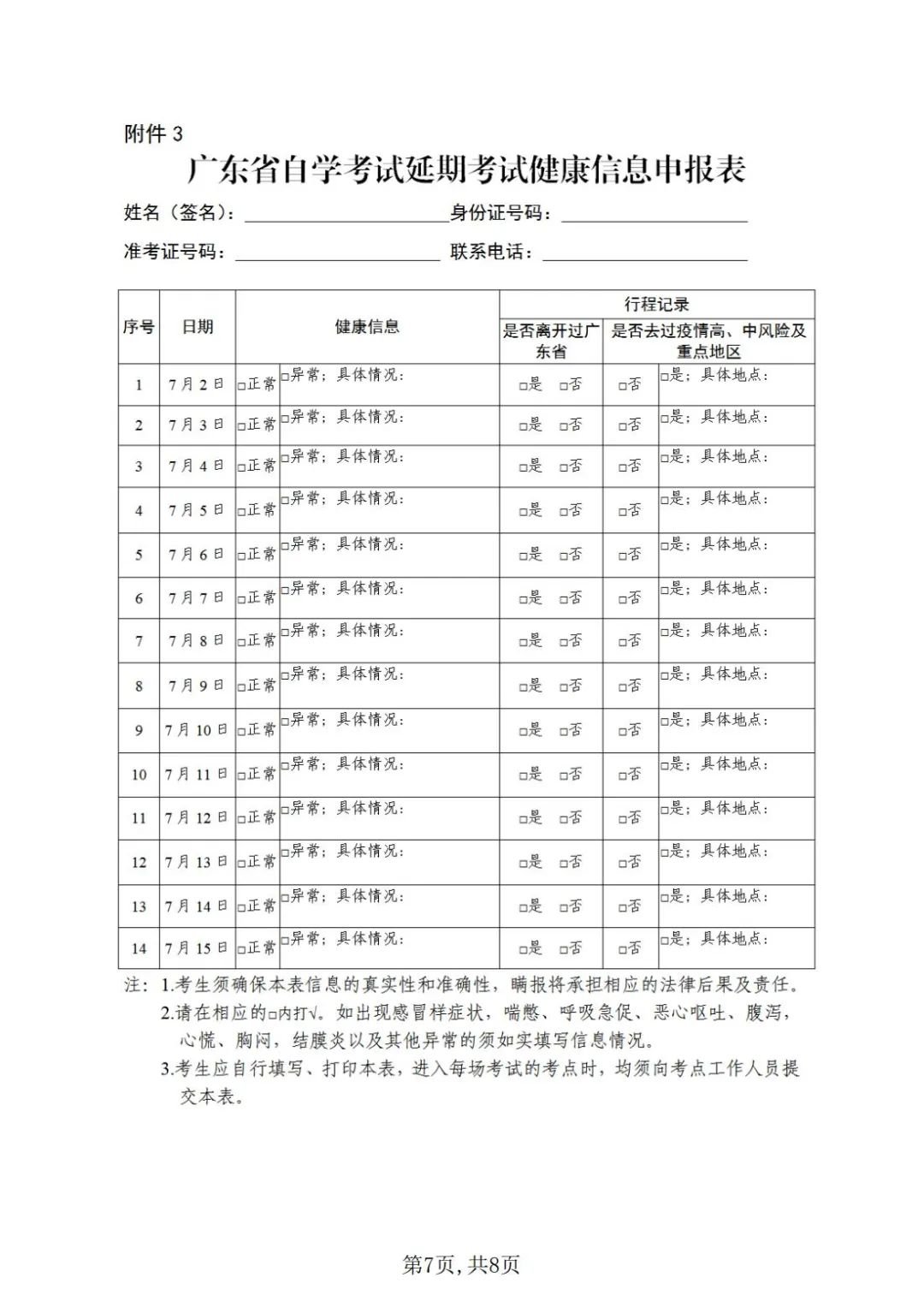 (二)所有考生必须自觉遵守我省自学考试疫情防控考生须知(附件1),严格遵守当地疫情防控各项规定和要求。考前14天考生应每天如实在广东省教育考试院官微中进行健康情况申报(申报说明见附件2),如实填写考前14天个人健康信息申报表(附件3),并在接受考前检查时向考点工作人员提供。考生隐瞒身体异常情况,提供虚假信息,造成严重后果的,依法追究相关人员责任。