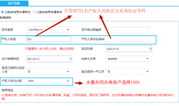 【以购房信息申请学位】:系统会显示“购房信息”的表格,用户可以根据自身情况与系统提示,填写证件类型、证件或合同编号、产权人姓名等一系列信息。购房地址栏请以购房合同(或房产证)的地址为准,填写镇、街道、小区名称等,具体到门牌号码。