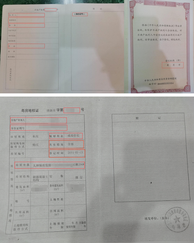 图片样例:包含不动产证号或购房合同编号,合同双方当事人情况,房屋基本情况(用途、详细地址),交付使用时间,签订合同日期或者发证日期。
