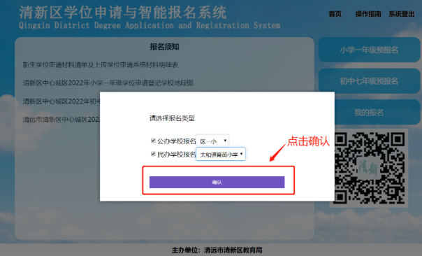 1、报名电脑端入口打开网页,访问清远市清新区人民政府门户网站,通过政府网上的入口进入“清新区学位申请与智能报名系统”。