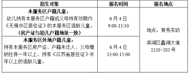 2.我园实行分批次录取,6月4日上午,只对本服务区内已有户籍或父母持有效期内《无锡市区居住证》的本服务区适龄的儿童。请家长按照通知时间段,来园现场报名,带好报名登记表及相关材料原件及复印件到幼儿园。报名材料审核验证通过后领取录取通知书。