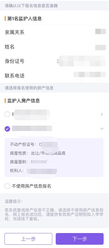 2.第1名监护人房产信息查验(若系统查询房产信息不正确,请选择不使用房产信息报名)