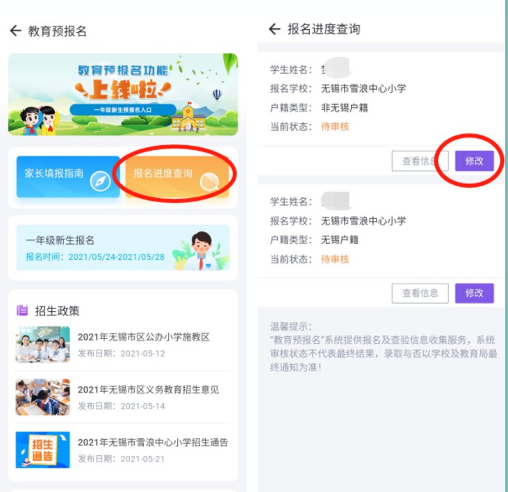 登录灵锡APP,进入【教育预报名】-【报名进度查询】-【修改】页面,若状态为“待审核”,可对报名信息进行修改(只有第1名监护人可进行修改操作)。