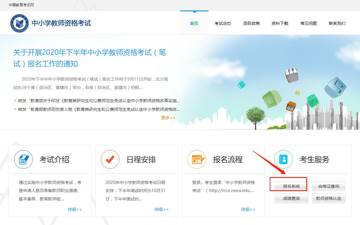 登陆中小学教师资格考试网(http://www.ntce.cn/),在右下角“考生服务”中选择“在线报名”按钮。