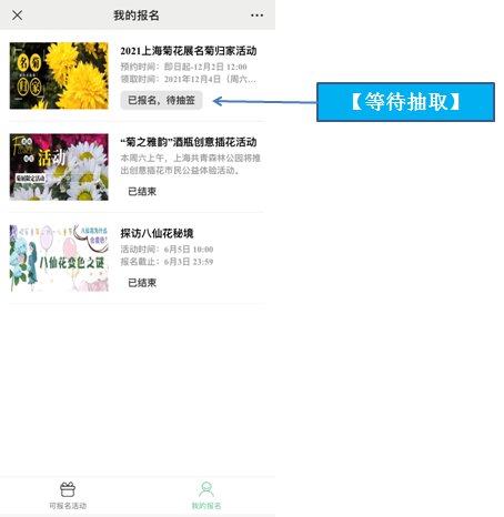 步骤4:提交成功后可在我的报名中查看报名状态,报名截止后会在后台进行随机抽取,抽中显示报名成功,未抽中则显示未抽中。