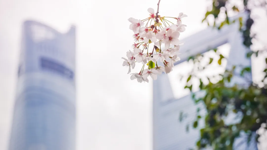在世纪大道,你能够体会到繁华大都市别样的樱花风情。前景是烂漫的樱花,背景是浦东新区高耸入云的摩天大楼。