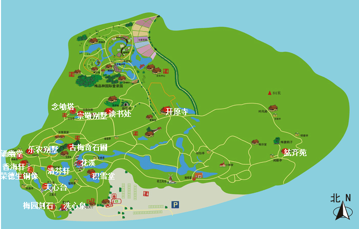无锡梅园的梅花品种可以分为四大系:真梅、杏梅、樱李梅、山桃梅,品种就太多了,看介绍有江梅、宫粉、玉蝶、黄香、绿萼、洒金、龙游、朱砂、美人梅等众多的品种。梅园的赏梅区域主要分布在荣氏梅园、古梅奇石圃、凝香道两侧、东横山及北园五个区域,每一个区域的梅花品种不同,开放的季节都不同,所以去赏梅的时候,可以根据你去的季节,选择去当时开放最旺盛的区域。具体如下: