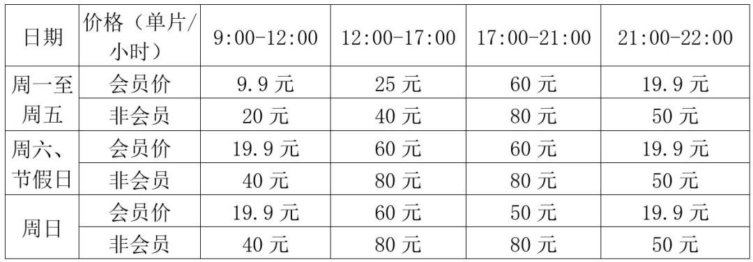 9:00-12:00 会员10元/小时,非会员30元/小时