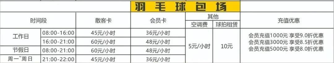 20:00-22:00 A场馆1-8号球场 45元/时;9-14号球场 40元/时