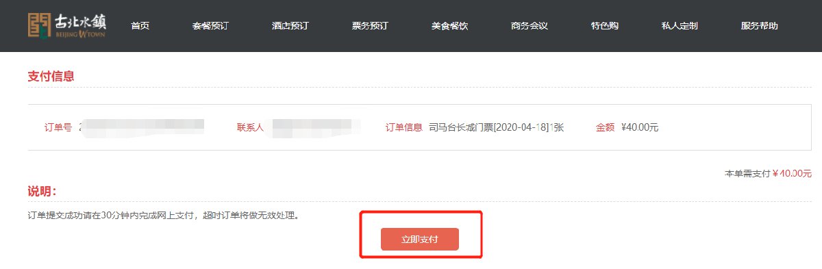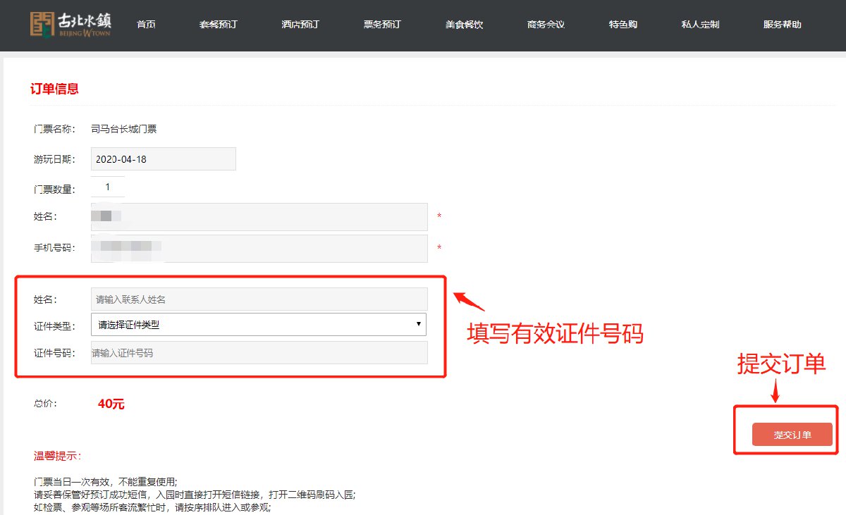 1、进入古北水镇官方预定网站,选择“票务预订”