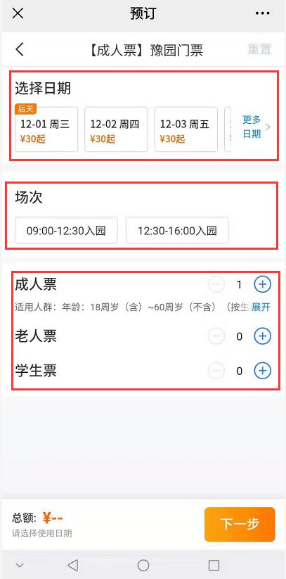 4.选择日期以及场次,选择门票数量,点击"下一步"。