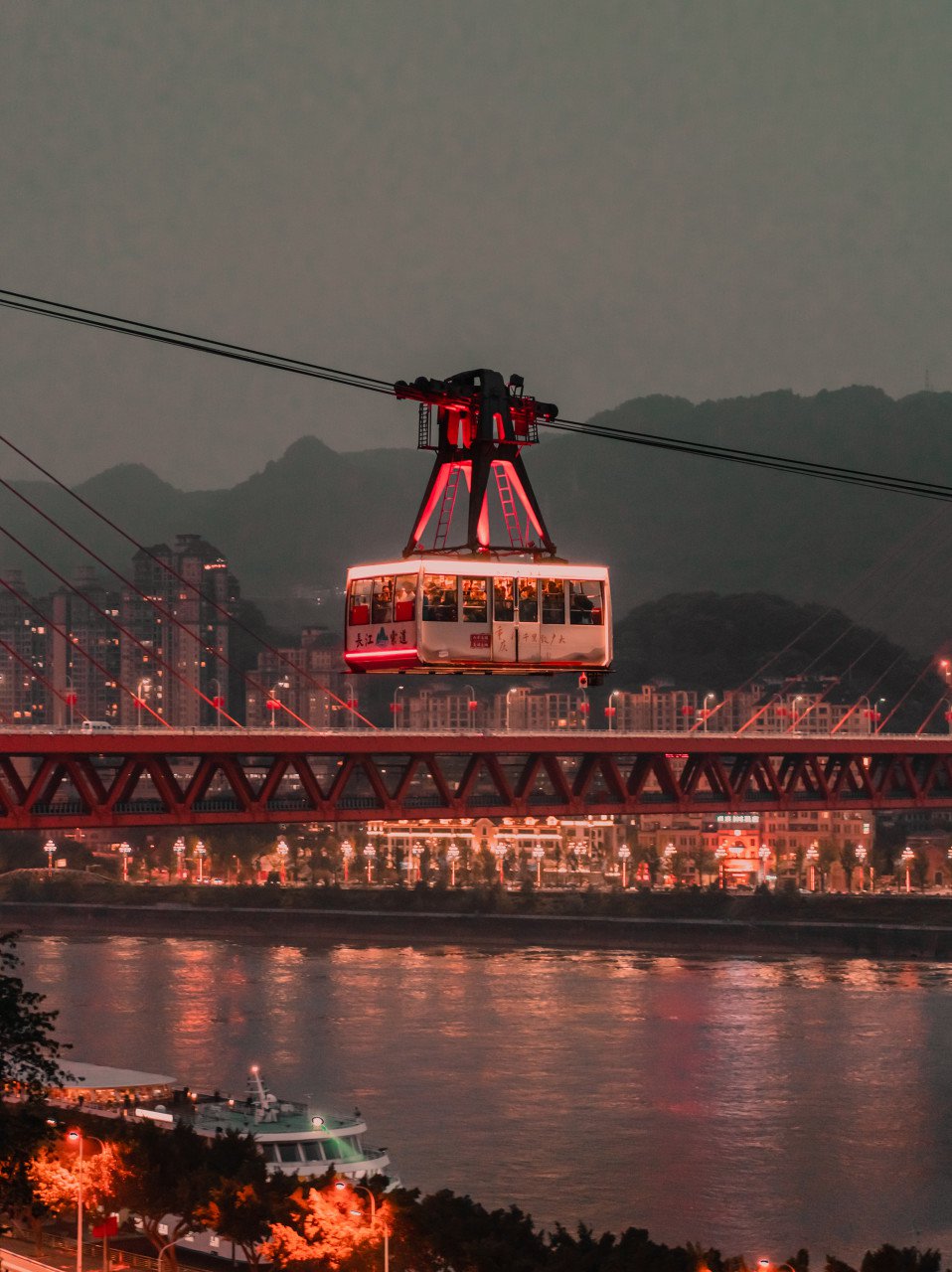 “不览夜景,未到重庆”,乘坐全程约千米的长江索道,是近距离俯瞰重庆夜景的不错体验。灯火辉煌的渝中半岛、璀璨夺目的滨江路、波光粼粼的长江水、流光溢彩的跨江大桥,交相辉映。如果你在蒙蒙细雨之夜,乘坐长江索道看夜景,还可欣赏到一幅水墨淡彩的《巴山夜雨图》,巴山雨态,水墨中的城市山林。