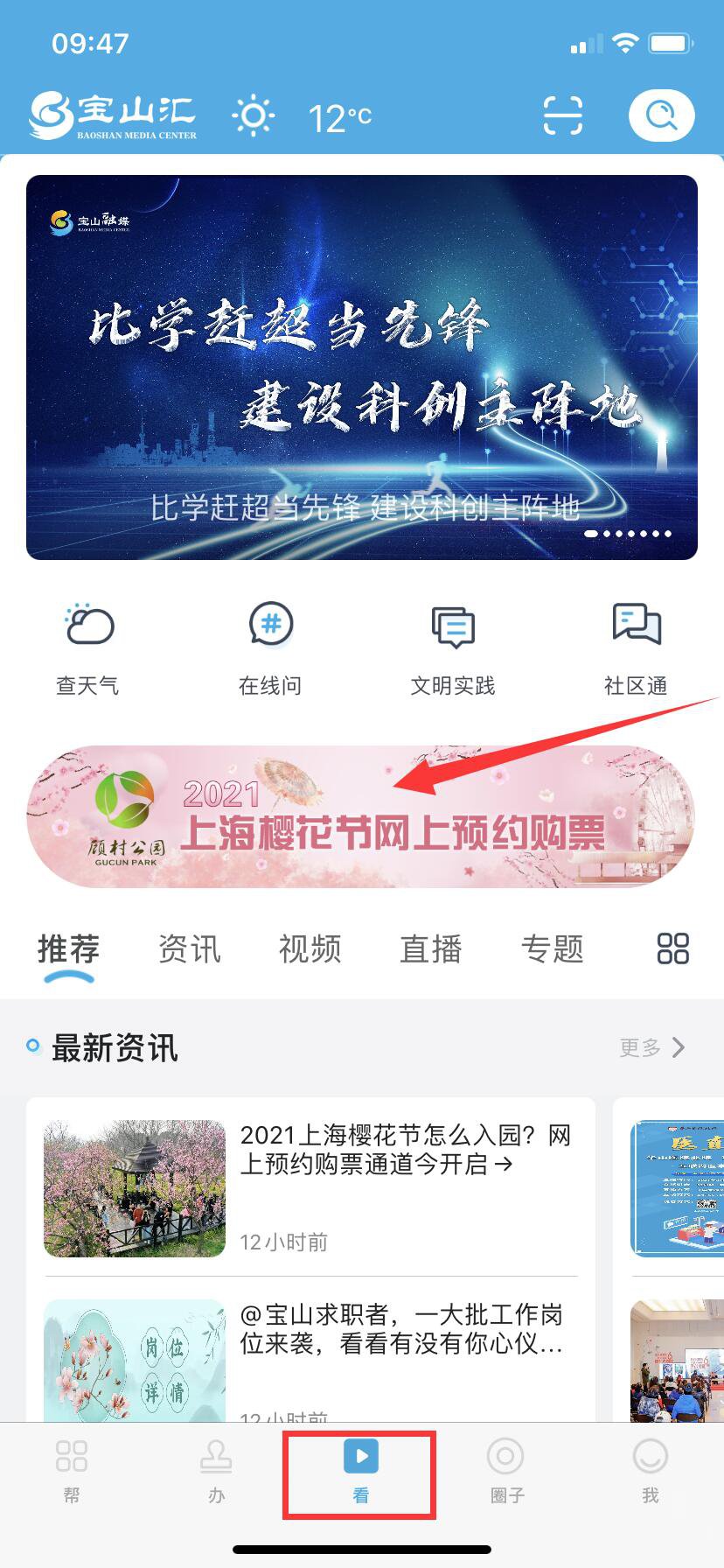 下载并打开宝山汇APP,点击底部【看】,即可看到上海樱花节网上预约购票入口,点击进入;