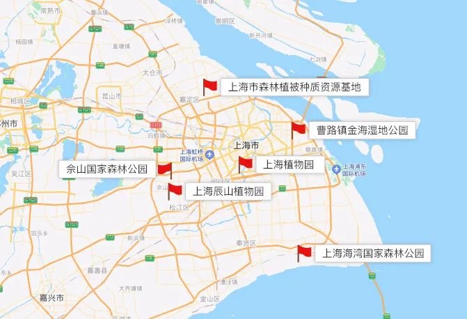 上海海湾国家森林公园、上海市森林植被种质资源基地、上海植物园、上海辰山植物园、佘山国家森林公园、曹路镇金海湿地公园