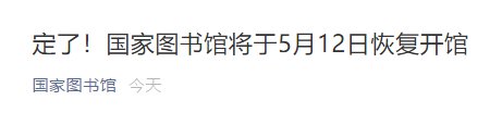 根据中央关于做好常态化疫情防控工作的指示精神,经报上级主管部门批准,国家图书馆将于2020年5月12日(周二)起,有序恢复开馆,实行预约限流服务。具体公告如下: