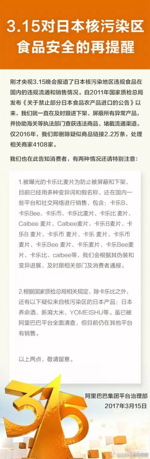 事件经315曝光后,阿里巴巴发布公告提醒消费者称,虽然很多平台已经下架了卡乐比麦片,但仍有两种情况需要特别注意。