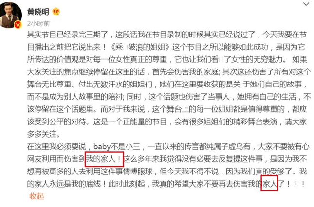 随后黄晓明两度发文护妻,称:baby不是小三!别伤害我的家人。
