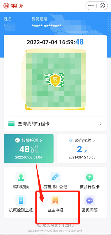 2、登录“支付宝”APP——湖北健康码——“自主申报”进行报备;