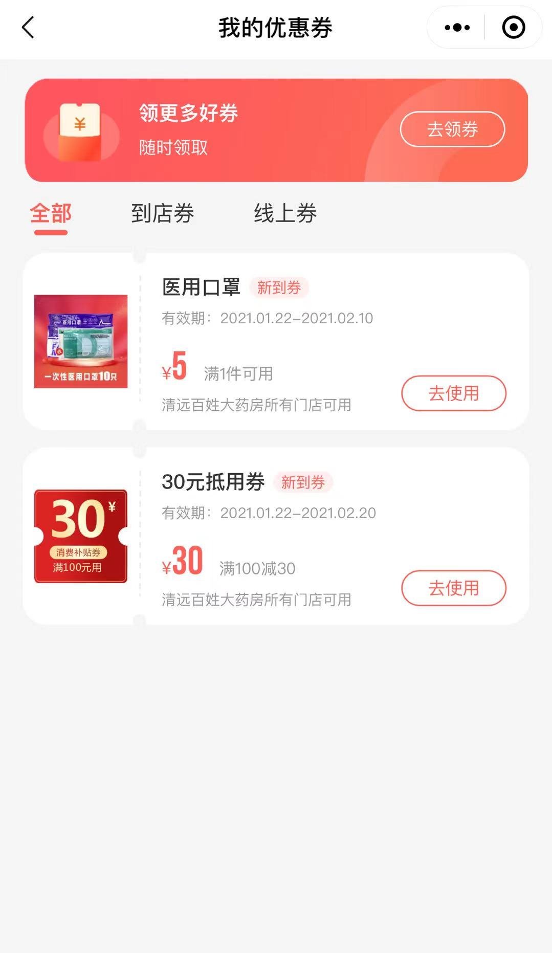 3、点击“去抢券”并确认购买后即可领取免费口罩电子券,可凭电子券到线下门店兑换免费口罩。