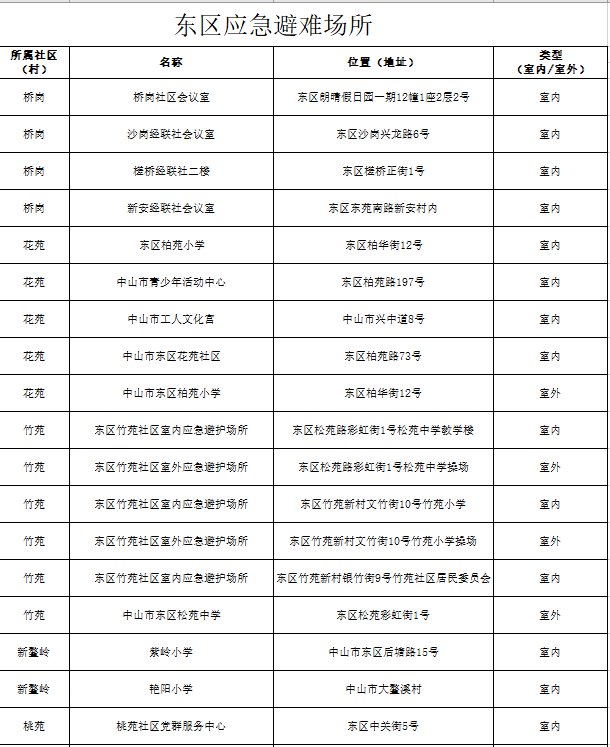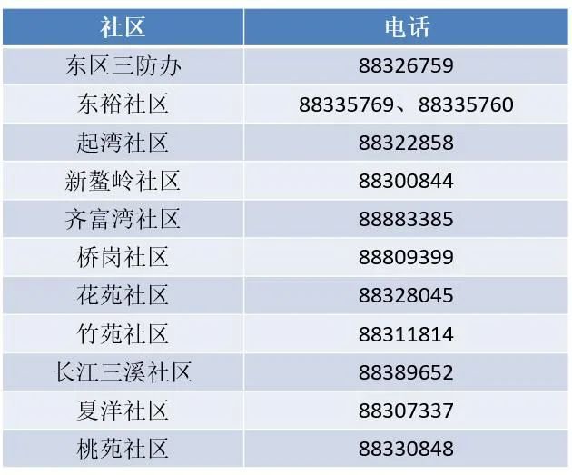 东区的应急避难场所,已全部开放,东区三防办及各社区联系电话如下: