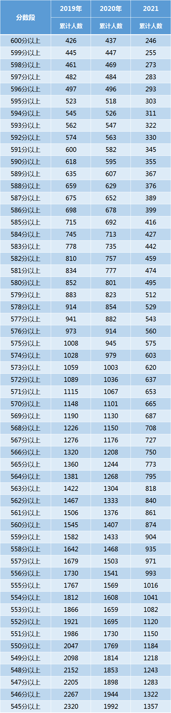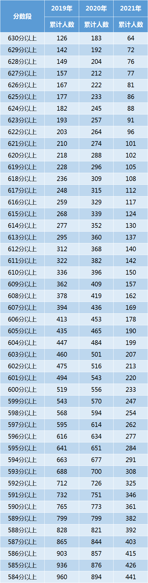 2019-2021年宁夏普通高考总分一分段统计表(理工类)