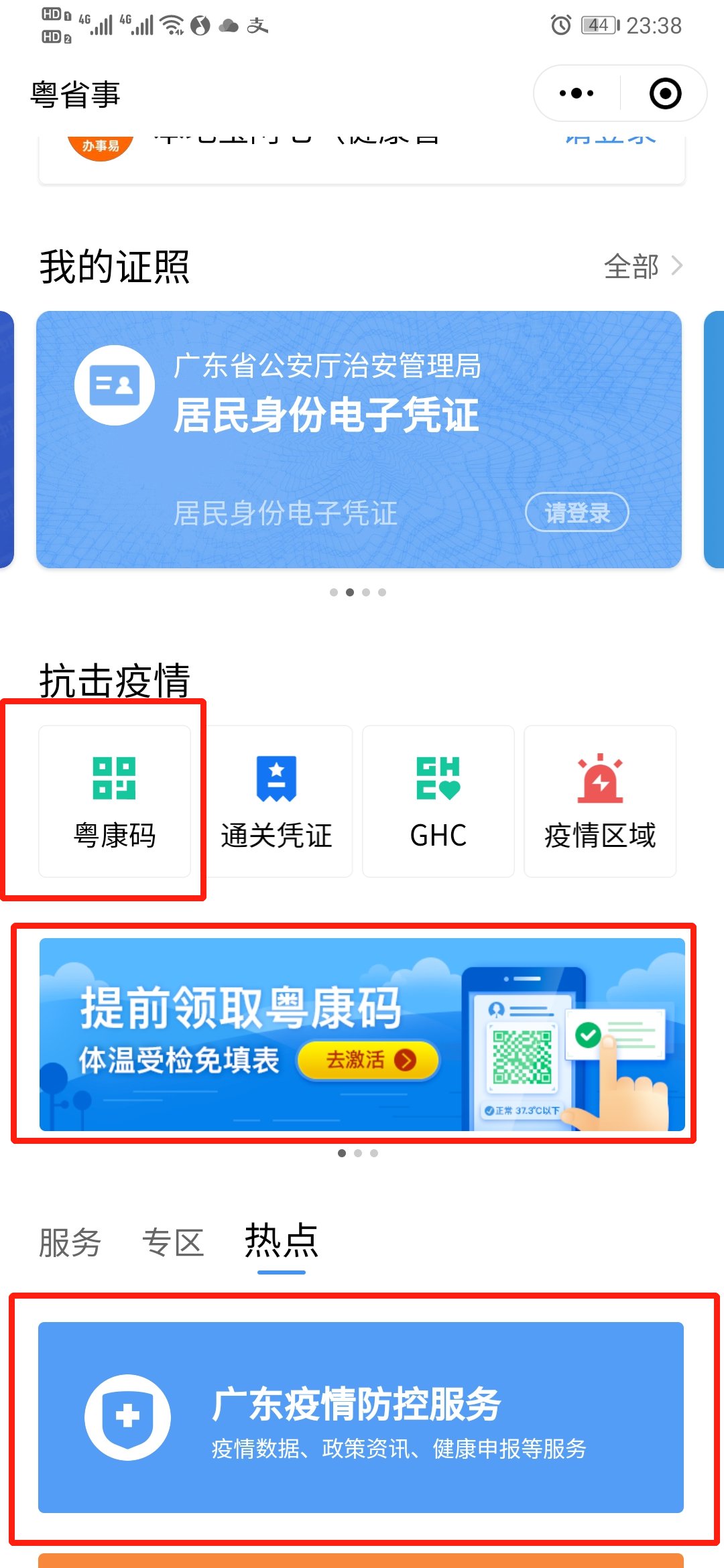 3.可从粤省事小程序首页-热点-疫情防控服务专区进入,在首页【我的粤康码】处点击进入。