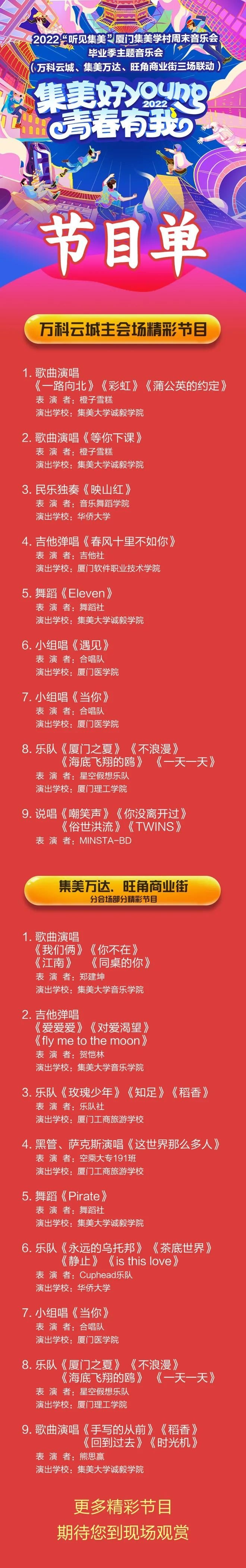 演出内容:集美辖区内各高校学子集结、赴约。校园乐队、器乐民乐、吉他弹唱、舞蹈、小组唱等风格多样的节目,精心打磨,献礼青春。