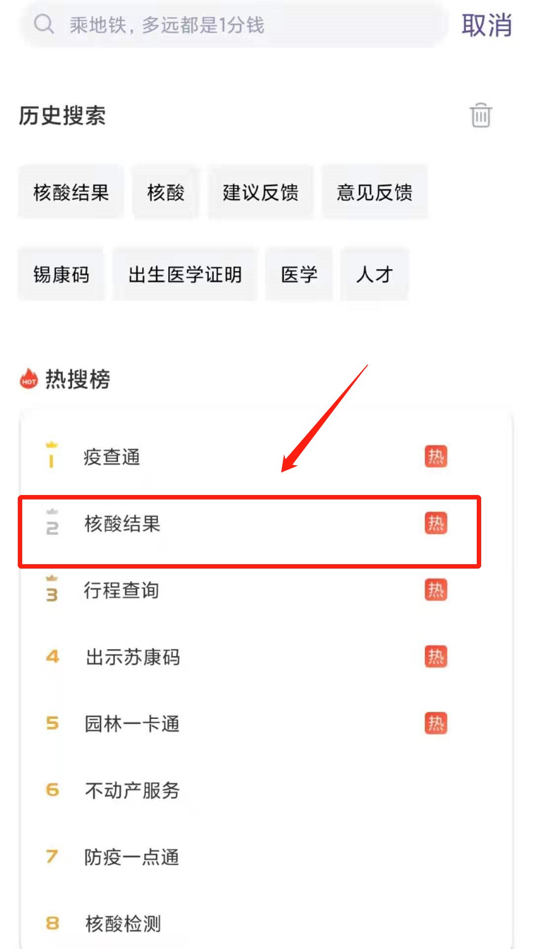 选择热搜榜中的“核酸结果”,或在搜索框中直接搜索“核酸结果”