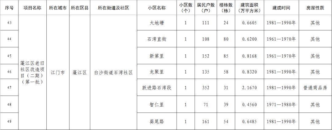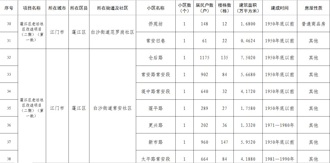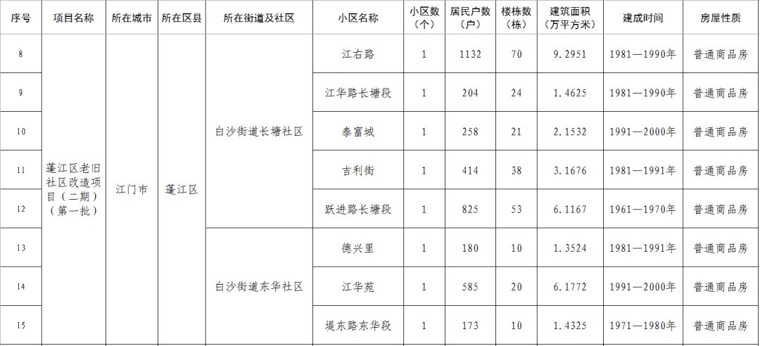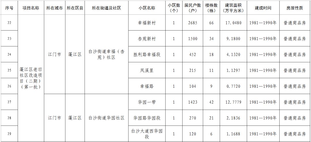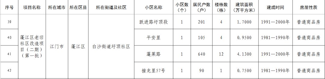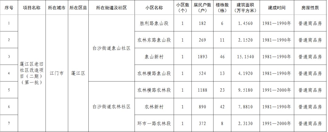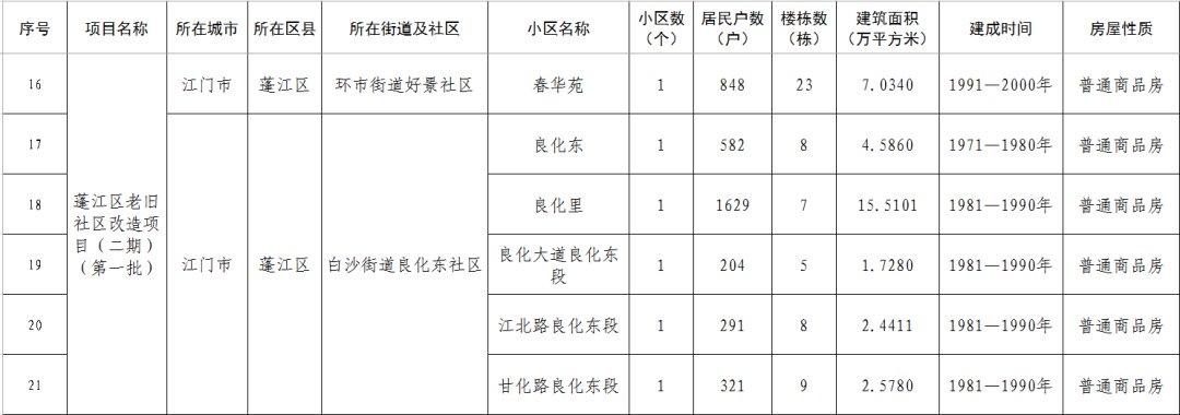 江门市蓬江区老旧小区改造项目二期(第一批)清单