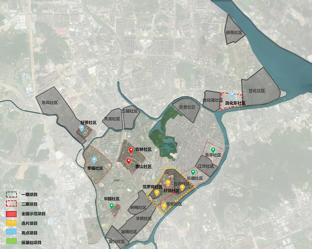 第一批进行改造的涉及象山、农林、长塘、良化东、幸福、好景、东华、华园、常安、圩顶、范罗岗以及石湾等12个社区49个小区,改造面积约为190.62万平方米;