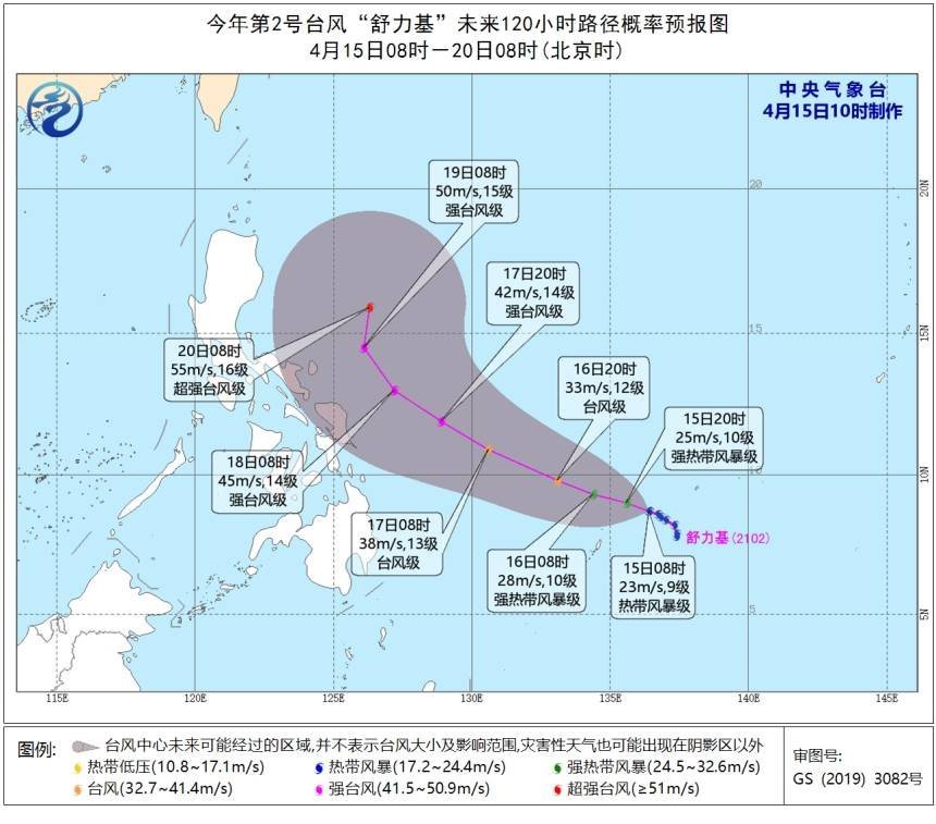 2021年第02号台风(热带风暴级),舒力基,04月15日14时位于北纬8.7°、东经136°,最大风速23m/s,中心气压990hPa。