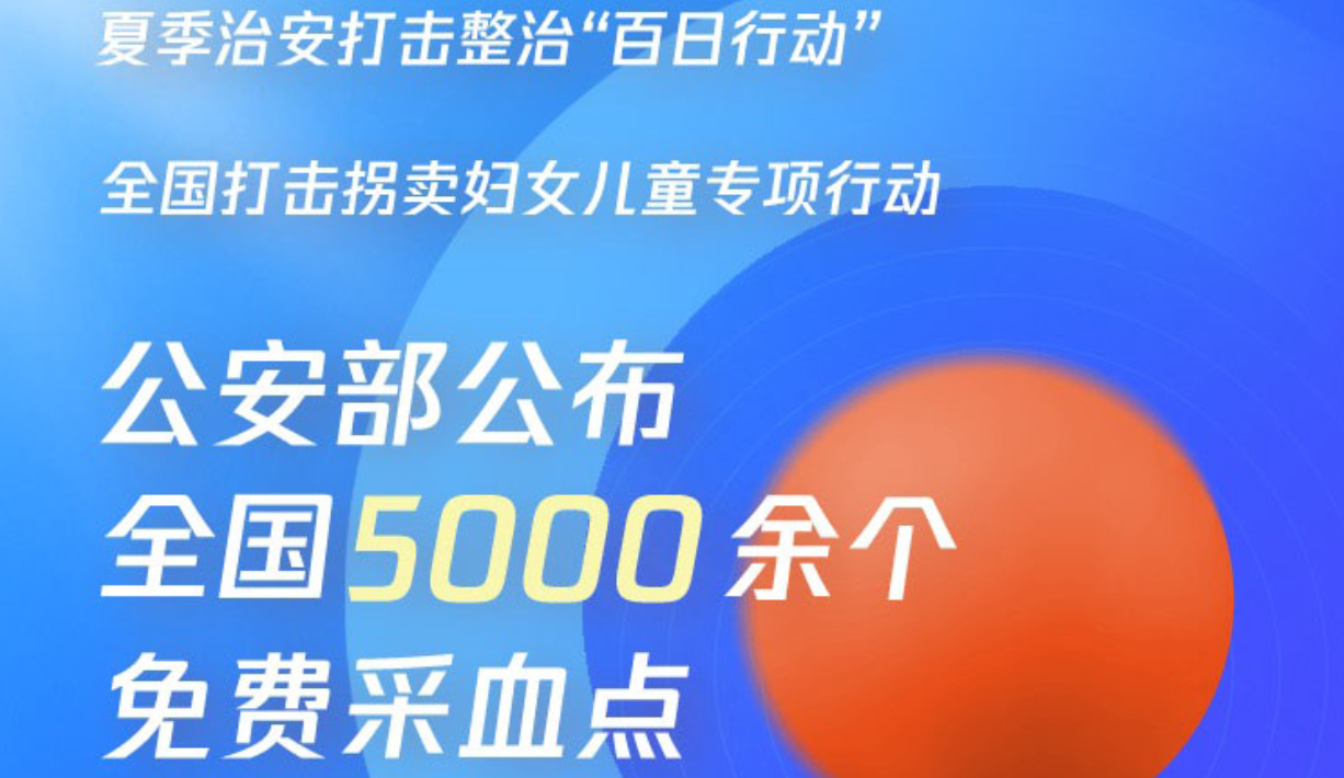 在夏季治安打击整治“百日行动”中,为深入推进打击拐卖妇女儿童犯罪专项行动,充分运用科技力量打拐寻亲,公安部近日公布全国5000余个免费采血点信息,进一步便利广大群众及时就近采血,助力被拐家庭早日实现团圆。