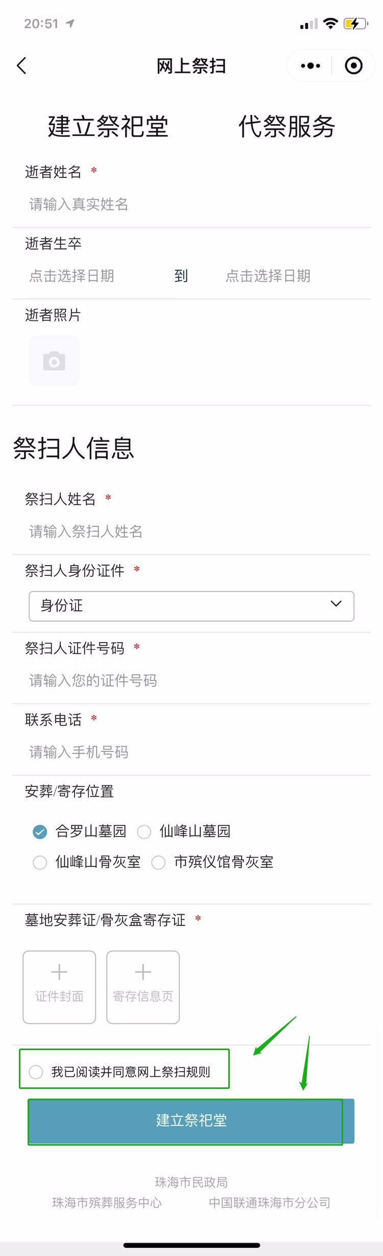 1、填写逝者真实姓名、祭扫人信息等,并选择“我已阅读并同意网上祭扫规则”,再点击“建立祭祀堂”;