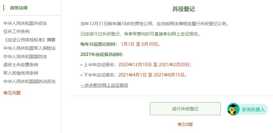在这个页面中,会告知我们报名时间以及参军的政策说明,建议看后,点击“进行兵役登记”,迈出你军旅生涯的第一步吧!