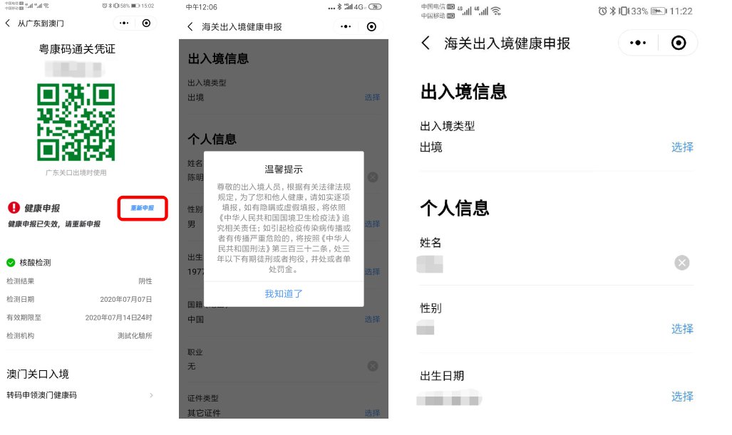海关出入境健康申报失效时,从粤康码通关凭证页面重新申报