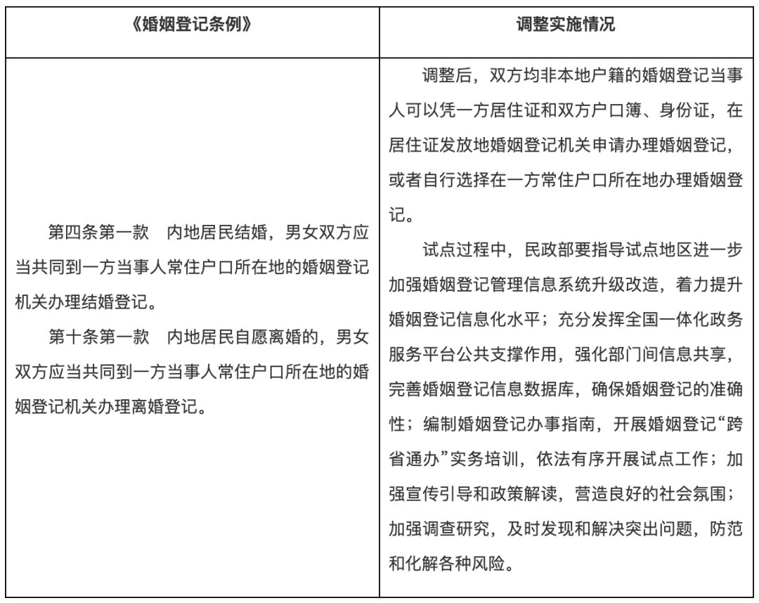 国务院同意在辽宁省、山东省、广东省、重庆市、四川省实施结婚登记和离婚登记“跨省通办”试点,在江苏省、河南省、湖北省武汉市、陕西省西安市实施结婚登记“跨省通办”试点。在试点地区,相应暂时调整实施《婚姻登记条例》第四条第一款、第十条第一款的有关规定(目录附后)。试点期限为2年,自2021年6月1日起至2023年5月31日止。