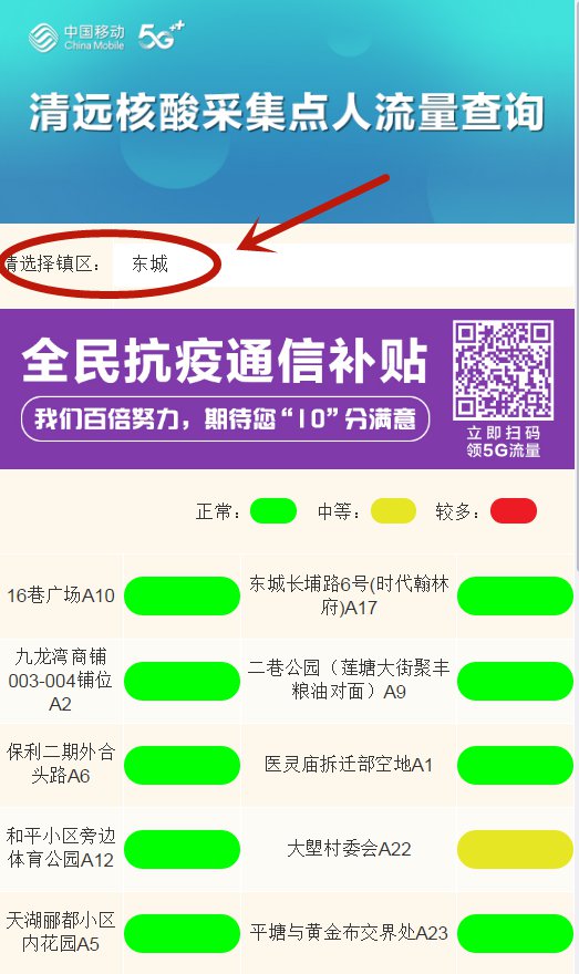 2.◆选择你所在的镇街,即可查询各核酸检测点的实时人流量。