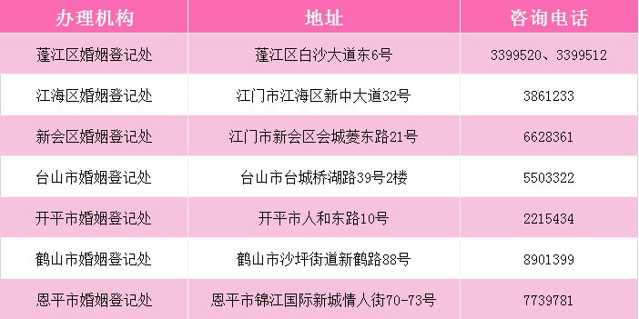 因当前疫情防控需求,江门市婚姻登记机关即日起,全面实行预约制办理业务,当事人需提前2至15天登录“广东民政”微信公众号、广东民政婚姻登记网上预约系统https://www.gdhy.gov.cn/、或“粤省事”平台预约,再按预约好的日期和时间段、前往相应的婚姻登记机关办证,陪同人员谢绝进入(特殊群体陪同人员除外)。佩戴好口罩,保持1米以上间隔距离,经体温检测正常、出示健康码“绿码”、行程码后,方可进入登记大厅办理登记。未预约、不佩戴口罩、体温异常、健康码非绿码的人员一律不得进场。