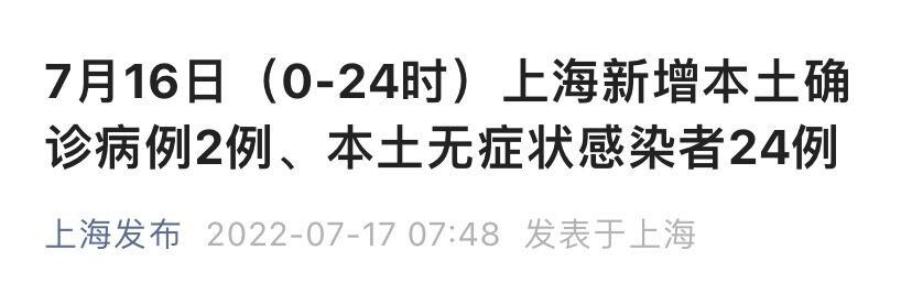 上海市卫健委7月17日通报:2022年7月16日0—24时,新增本土确诊病例2例和无症状感染者24例,其中2例确诊病例和23例无症状感染者在隔离管控中发现,其余在风险人群筛查中发现。