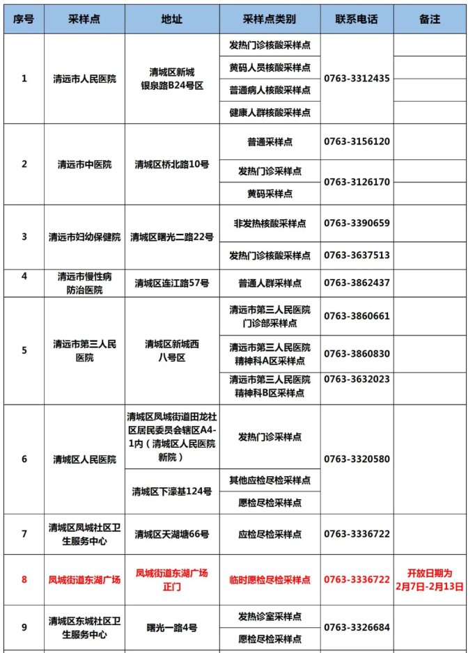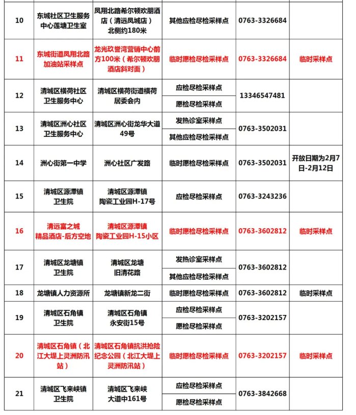 截至2月10日,清城区核酸检测采样点位从17个增至21个,新增的4个点位分别是凤城街道东湖广场采样点、东城街道凤翔北路加油站采样点、源潭镇富之城精品酒店-后方空地采样点和石角镇北江大堤上灵洲防汛站采样点。另外,部分采样点类别也有相应调整。